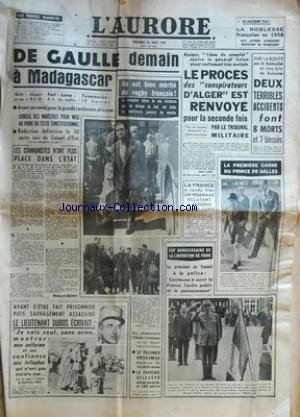la noblesse fran+ºaise en 1958 - nos lecteurs approuvent protestent ou interrogent de gaulle demain a madagascar - avant son envol pour la grande randonnee africaine - conseil des ministres pour mise au point du texte constitutionnel redaction definitive le 30 apres avois du conseil d'etat xive anniversaire de la liberation de paris - le president du conseil a la police - continuez l'ordre public et le gouvernement avant d'etre faut prisonneir puis sauvagement assasine le lieutenant dubos ecrivait - je vais seul sans arme montrer mon uniforme et ma confiance aux fellaghas qui n'ont pas encore osee... les communistes n'ont plus place dans l'etat ils ont bien merite du rugby fran+ºais - le triomphal retour de nos tricolores qui en afrique du sud ont battu les meilleurs joueurs du monde kovasc l'ame du complot contre le general salan etant reellement tres malade - le proces des conspirateurs d'alger est renvoye poru la seconde fois par le tribunal militaire sur la route pres de rambouil