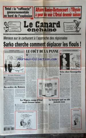 TOTAL / LA RAFFINERIE GOUVERNEMENTALE AU BORD DE L'EXPLOSION - AFFAIRE BARNIER-BETTENCOURT / L'ELYSEE A PEUR DE VOIR L'OREAL DEVENIR SUISSE - MENACE SUR LE CARBURANT A L'APPROCHE DES REGIONALES - LE NIGER - COUP D'ETAT MAIX BONNE MINE - LA BANQUE QUI NE DIT JAMAIS NON - GISCARD - BARROT - CHARASSE / PROTESTATIONS AU CONSEIL CONSTITUTIONNEL
